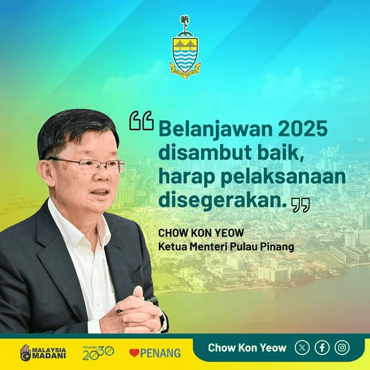 Kerajaan Negeri Pulau Pinang menyambut baik pengumuman pelaksanaan projek Lebuh Raya Bertingkat Juru dan Sungai Dua yang dibentangkan dalam Belanjawan Madani 2025 oleh YAB Perdana Menteri sebentar tadi, dan berharap ia dapat dilaksanakan dalam tempoh terdekat kerana ia merupakan keperluan yang amat meruncing kini.