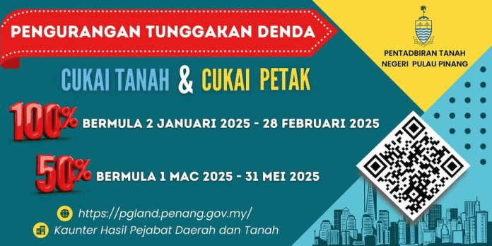 Kerajaan Negeri Pulau Pinang menerusi Majlis Mesyuarat Kerajaan (MMK) minggu lalu bersetuju memberikan pengecualian tunggakan denda cukai tanah dan cukai petak sebanyak 100 peratus kepada semua pemilik tanah serta petak di negeri ini yang membuat bayaran cukai (tanah dan petak) masing-masing mulai 2 Januari 2025 sehingga 28 Februari 2025.